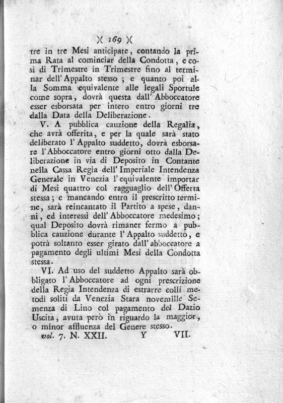 Nuova raccolta di tutte le carte pubbliche, leggi, e proclami stampate, ed esposte ne' luoghi piu' frequentati di Venezia e sue provincie dopo il felice ingresso dell'armi austriache di S.M. Imperatore, e Re nel Veneto Stato. Volume settimo